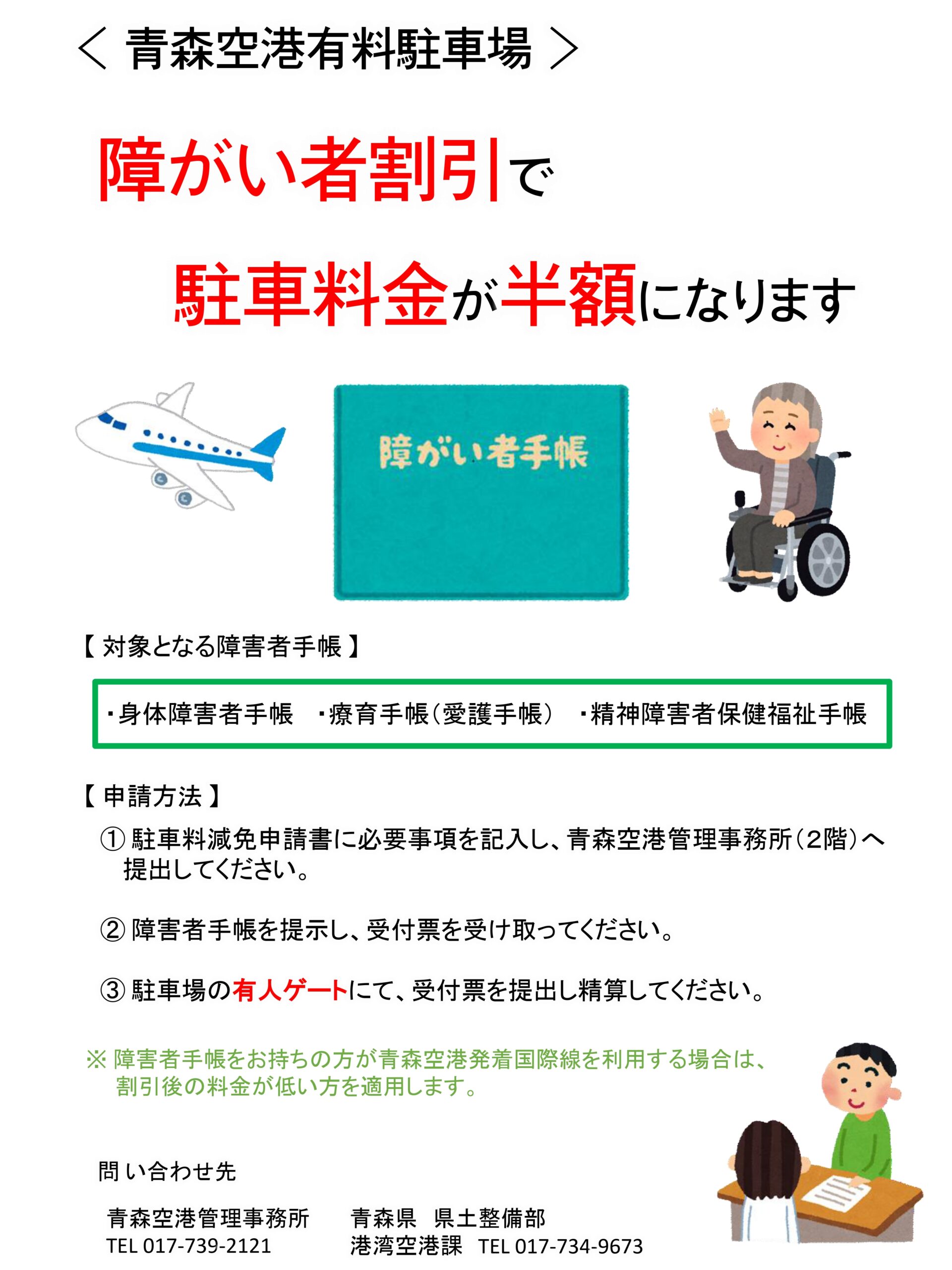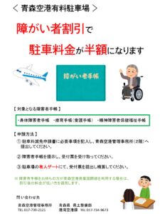 青森空港管理事務所より、有料駐車場「障がい者割引制度」のご案内です。